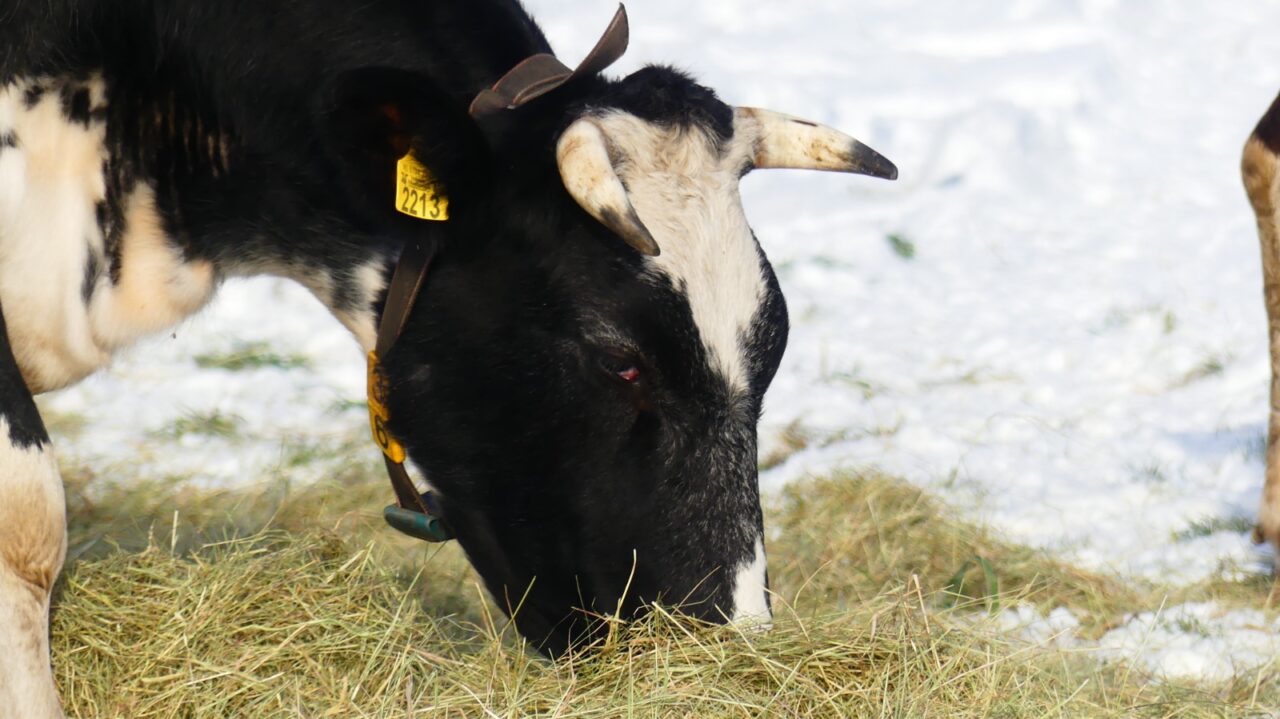 Elke dag krijgen de koeien van Karst een nieuw stuk perceel van een halve hectare. Pas na minimaal 60 dagen komen de koeien weer op hetzelfde land terug. Het gras heeft zo genoeg tijd om te groeien en herstellen. ‘Ik heb me ontzettend verbaasd over hoe snel het gras weer terug groeit in het najaar. Tot laat in het jaar had ik nog veel gras op het land en kon ik meer voorraad overhouden. Rond deze tijd van het jaar (januari) hebben ze een stuk minder voer nodig. We rollen nu iedere dag hooi uit op een nieuwe halve hectare zodat ze genoeg binnenkrijgen. Toen de sneeuw begon te smelten was het soms wel lastig. Het is dan erg nat en soms lopen ze een stukje zwart. Maar dit herstelt wel weer.